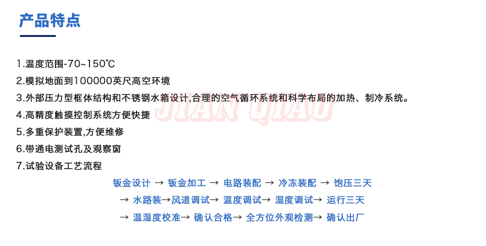 產(chǎn)品型號(hào):JQTA-504 品牌:劍 喬 用途:高低溫低氣壓試驗(yàn)箱主要用于試驗(yàn)工件在低氣壓、高溫低溫單項(xiàng)或同時(shí)作用下的環(huán)境適應(yīng)性與可靠性試驗(yàn),并或同時(shí)對(duì)試件通電進(jìn)行電氣性能參數(shù)的測(cè)量。咨詢熱線:13829135130