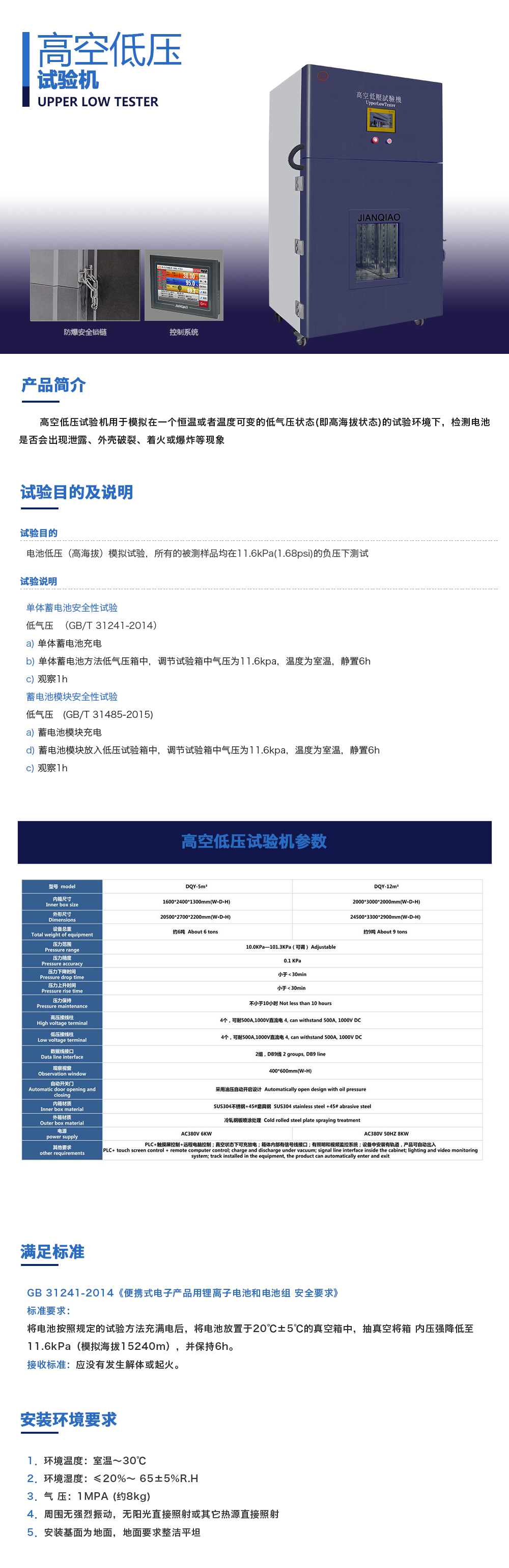 產(chǎn)品型號(hào):JQ-8104(可定制) 品牌:劍 喬 用途:高空低壓試驗(yàn)機(jī)用于模擬在一個(gè)恒溫或者溫度可變的低氣壓狀態(tài)(即高海拔狀態(tài))的試驗(yàn)環(huán)境下,檢測電池是否會(huì)出現(xiàn)泄露、外殼破裂、著火或爆炸等現(xiàn)象。咨詢熱線:13829135130