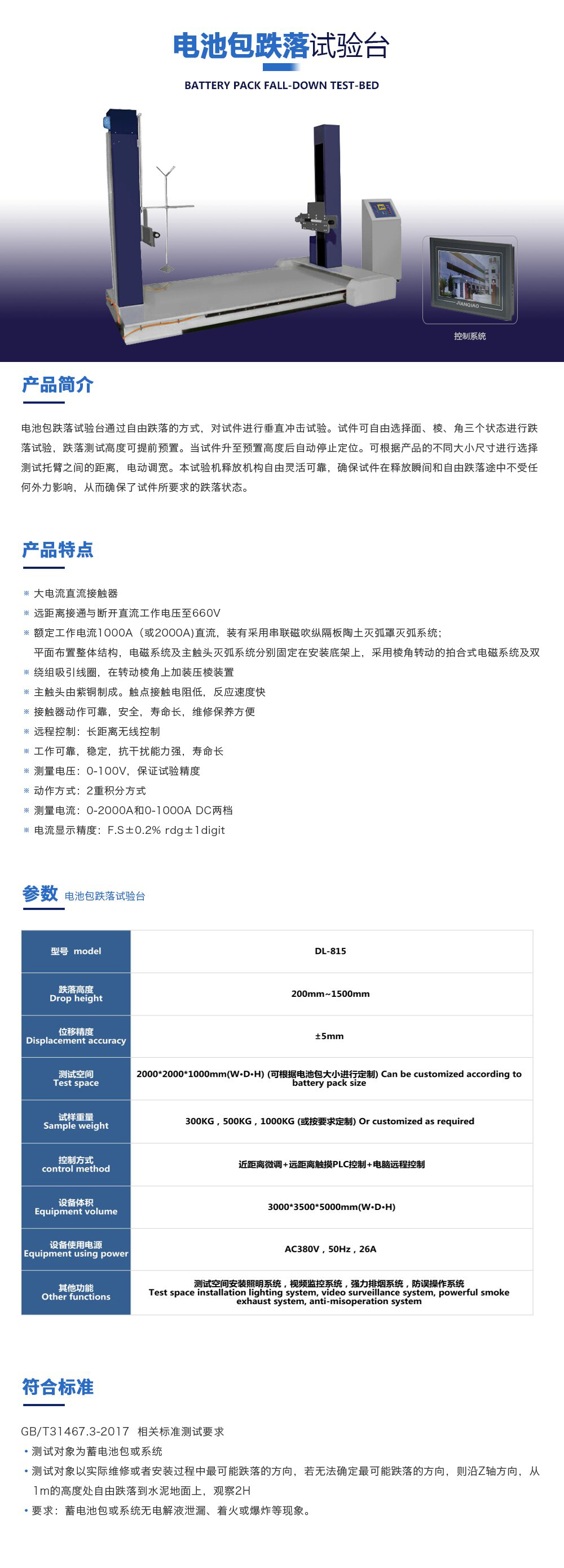 產(chǎn)品型號(hào):JQ-F-815 品牌:劍 喬 用途:電池包跌落試驗(yàn)臺(tái)通過(guò)自由跌落的方式,對(duì)試件進(jìn)行垂直沖擊試驗(yàn)。試件可自由選擇面、棱、角三個(gè)狀態(tài)進(jìn)行跌落試驗(yàn),跌落測(cè)試高度可提前預(yù)置。當(dāng)試件升至預(yù)置高度后自動(dòng)停止定位咨詢(xún)熱線(xiàn):13829135130