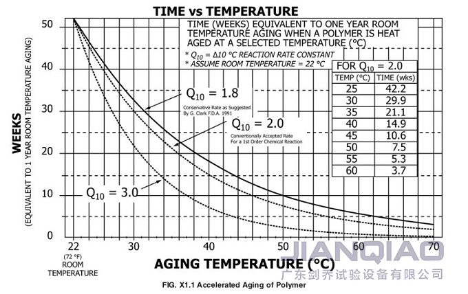大家仔細分析上述兩個公式可以發(fā)現(xiàn),決定加速老化時間的關(guān)鍵因素是加速老化溫度,根據(jù)ASTM F1980-16附錄X1.1,能夠明確無菌屏障系統(tǒng)在選定溫度下的熱老化相當(dāng)于1年的室溫老化的時間。例如,若確定Q10為2,加速老化溫度選用50℃,則加速老化時間為7.5周。特別要注意的是,大多數(shù)醫(yī)用聚合物建議的溫度上限是60℃。