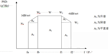為了簡便起見,往往將功率譜密度曲線圖劃分成若干矩形和三角形,并利用上升斜率(如3dB/oct)和下降斜率(如-6dB/oct)分別算出wa 和w2,然后求各個(gè)幾何形狀的面積與面積和,再開方求出加速度總均方根值。