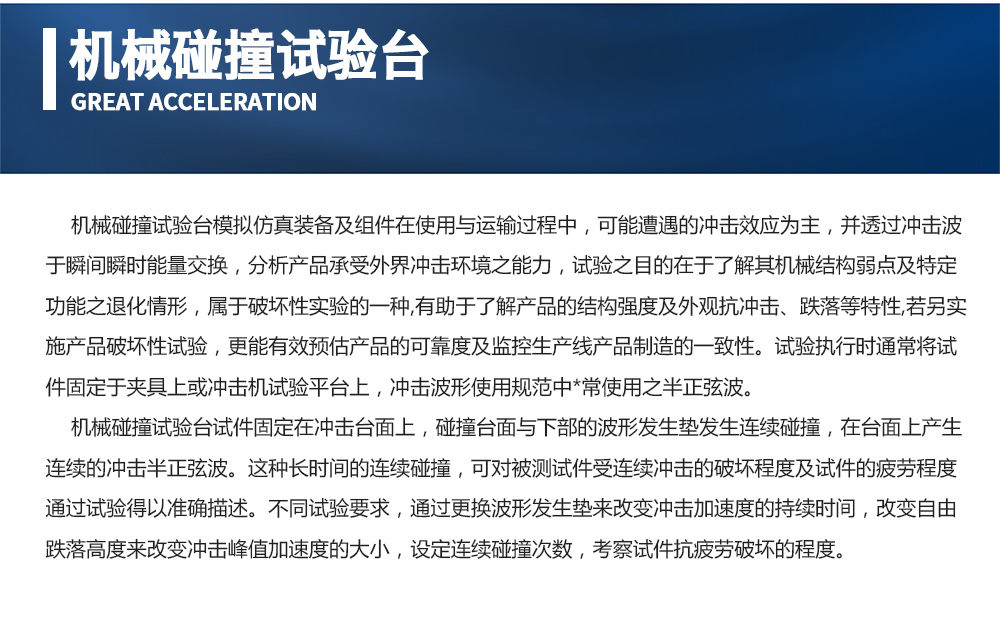 產(chǎn)品型號:JQJ-100 品牌:劍 喬 用途:機械碰撞試驗臺模擬仿真裝備及組件在使用與運輸過程中,可能遭遇的沖擊效應(yīng)為主,并透過沖擊波于瞬間瞬時能量交換,分析產(chǎn)品承受外界沖擊環(huán)境之能力,試驗之目的在于了解其機咨詢熱線:13829135130